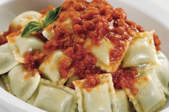 Finalmente, servimos unos deliciosos Ravioles de Pastas Ale, agregando la salsa, la albahaca y el queso rallado. ¡Un plato perfecto para sorprender a tu familia!